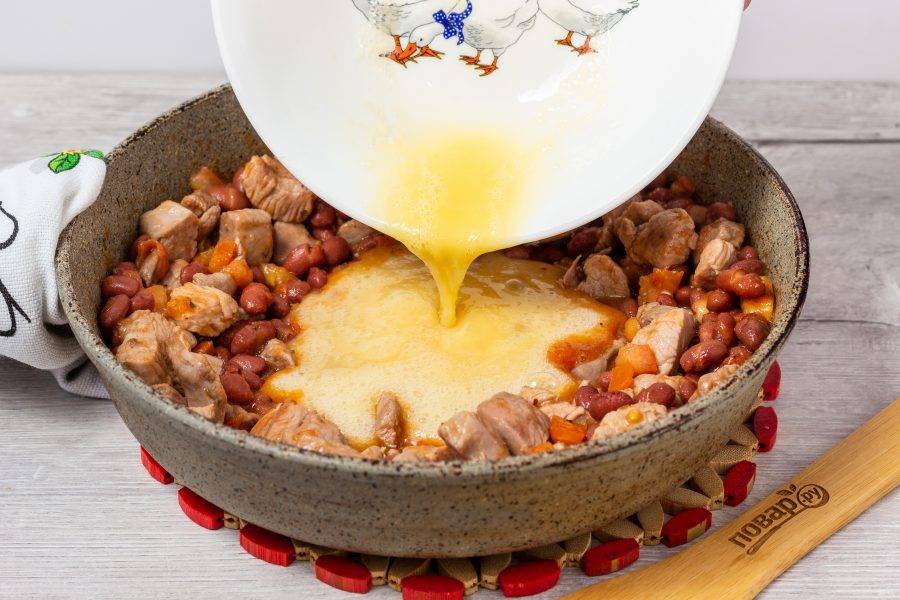 Раздвиньте массу по краям сковороды, а в середину вылейте взбитые вилкой яйца. Как только яйца начнут схватываться, перемешайте их с основной массой и жарьте ещё 1-2 минуты.