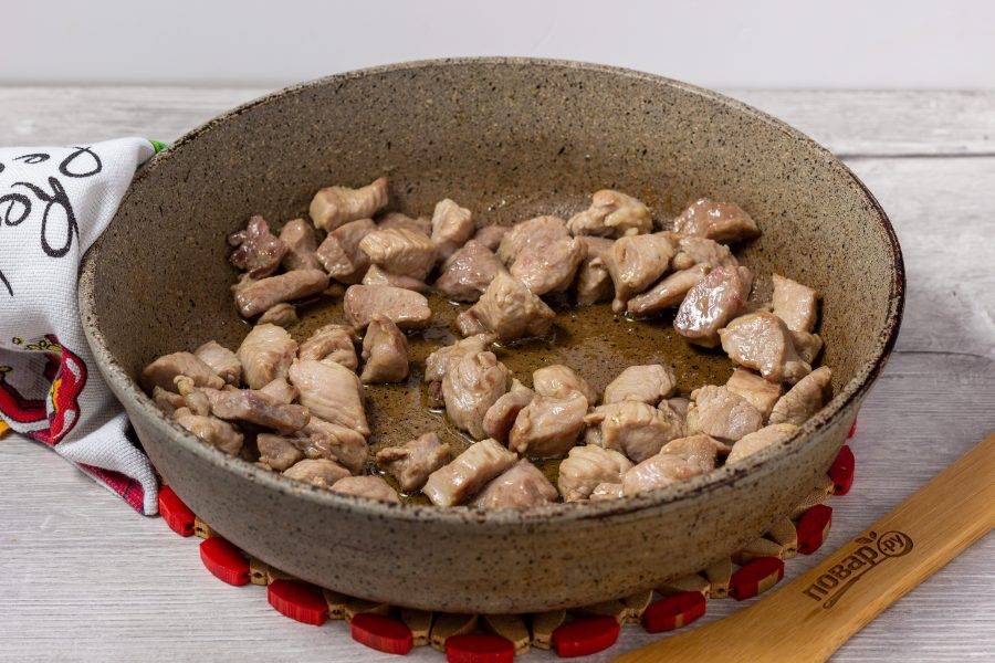 Филе индейки нарежьте небольшими кусочками, обжарьте до готовности в оливковом масле, посолите по вкусу.