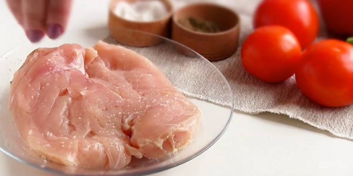1. Куриное филе промойте, обсушите бумажным полотенцем, посолите, поперчите и приправьте специями. Лук нарежьте тонкими полукольцами, помидоры разрежьте на дольки, а сладкий перец — на 4-5 частей.