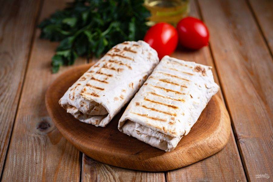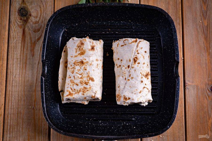 Сверните тортильи, подгибая края, и выложите на сухую сковороду. Прогрейте буррито на среднем огне примерно по 3-4 минуты с двух сторон.