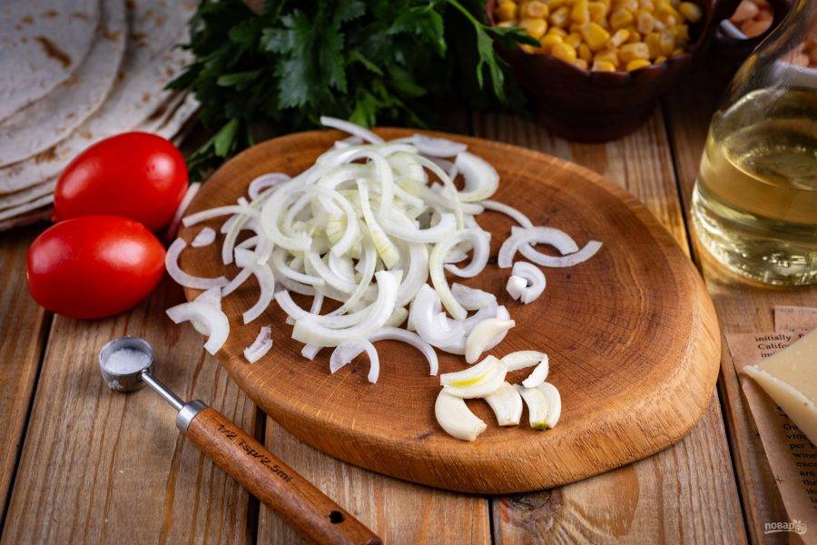 Лук почистите и нашинкуйте тонкими полукольцами. Чеснок также почистите и нарежьте тонкими пластинами.