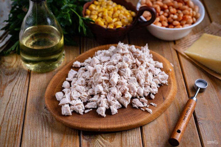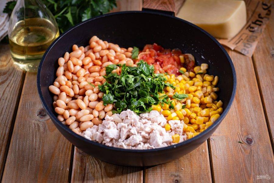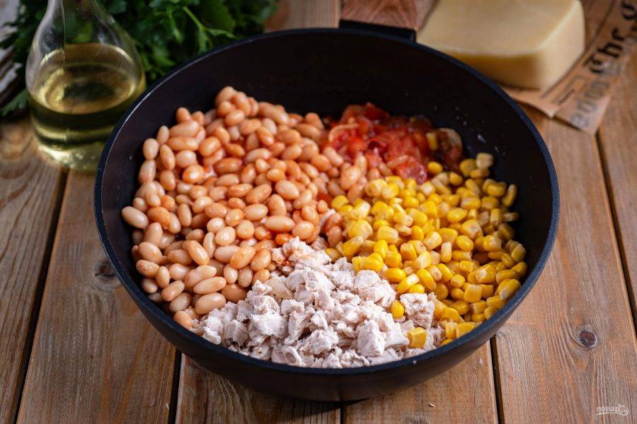 В сковороду к остальным ингредиентам добавьте фасоль (уже без жидкости), кукурузу (тоже без жидкости), кусочки отварной курицы.
