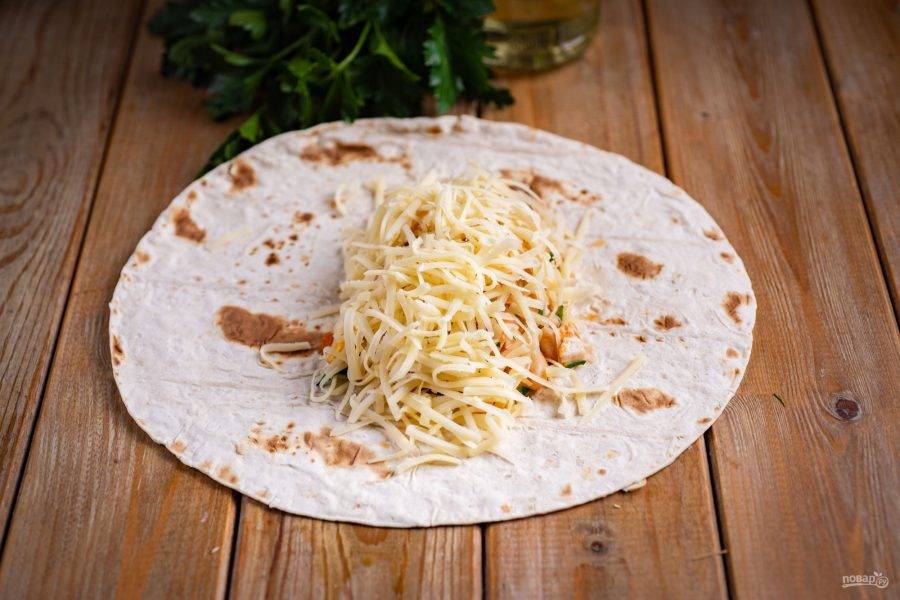 Тортилью разогрейте на сухой сковороде, чтобы она стала более мягкой и не ломалась при сворачивании. На центр выложите 1/4 часть всей начинки и сверху присыпьте тертым сыром.