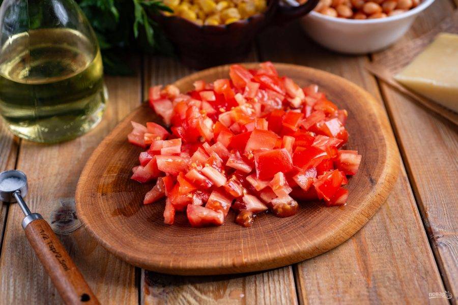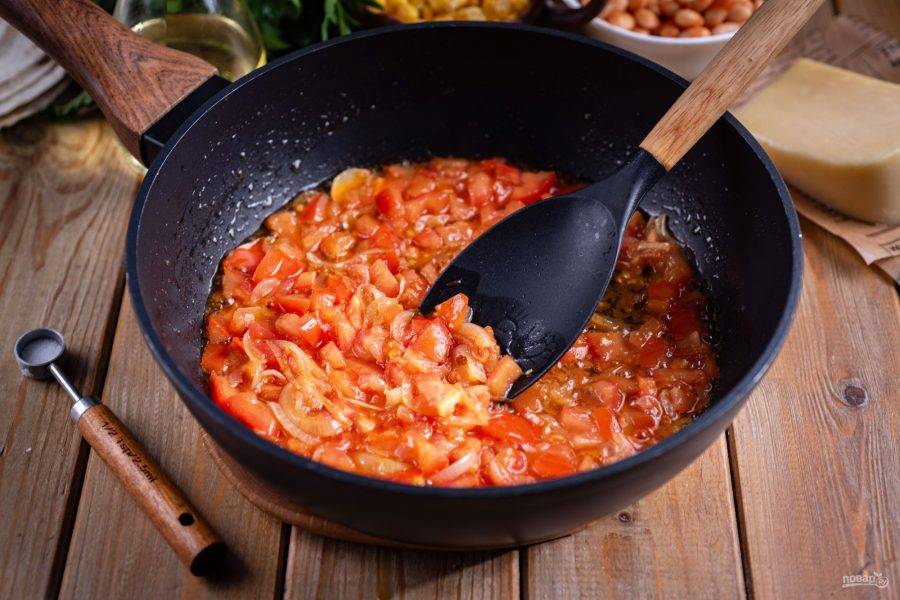 Добавьте в сковороду нарезанные помидоры, добавьте 3 ст.л. соуса из фасоли. Тушите все вместе на среднем огне около 5 минут.
