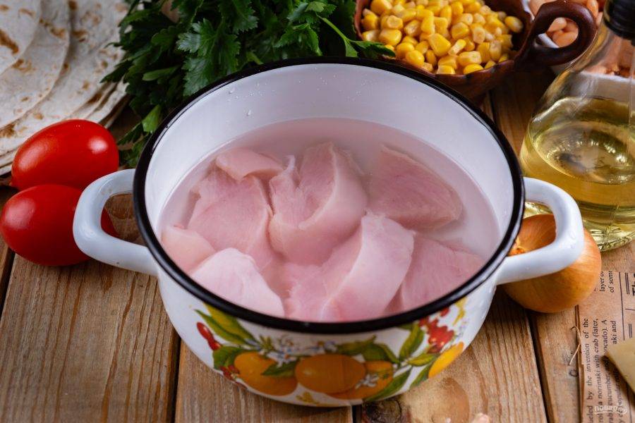 Для быстроты и удобства куриное филе нарежьте небольшими кусочками, выложите в кастрюлю с водой и отварите до готовности.