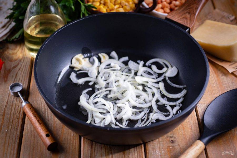 В сковороде разогрейте растительное масло и выложите луковые кольца, нарезанный чеснок — обжаривайте на большом огне, помешивая лопаткой, в течение 4-х минут.