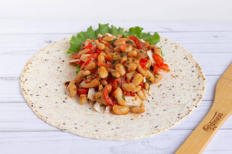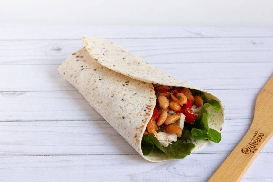 Заверните начинку в тортилью. Сначала подверните нижнию часть, затем 2 боковые. Буррито с фасолью готово!