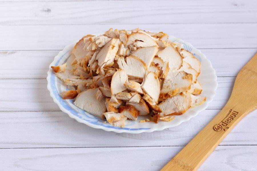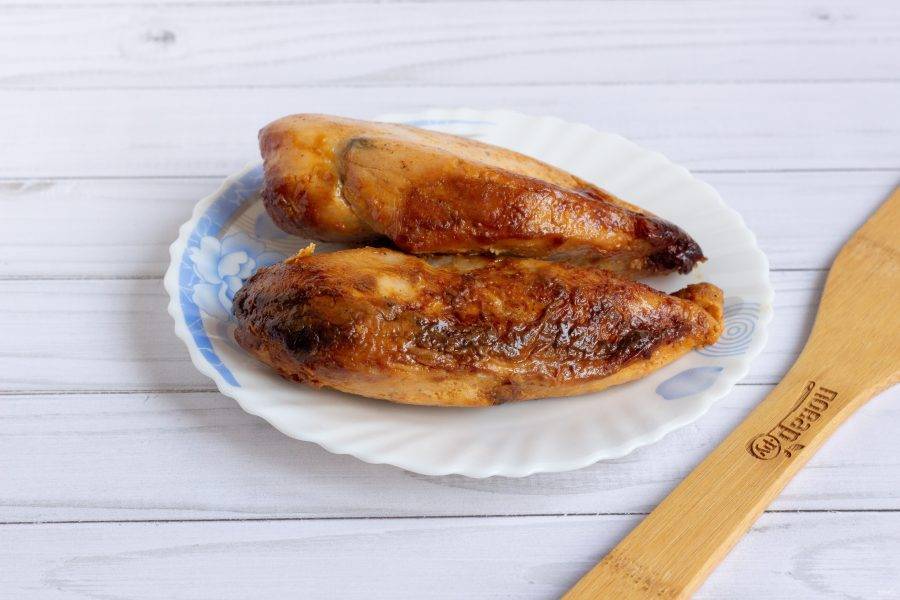 Куриную грудку помойте, посолите и обжарьте на оливковом масле с двух сторон до готовности или приготовьте на гриле с соусом барбекю.