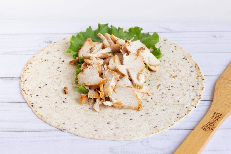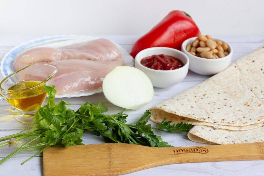 Буррито — мексиканское блюдо, состоящее из мягкой пшеничной лепёшки (тортильи), в которую завёрнута разнообразная начинка. Предлагаю в качестве начинки взять фасоль и куриную грудку. Получается очень вкусно и сытно!