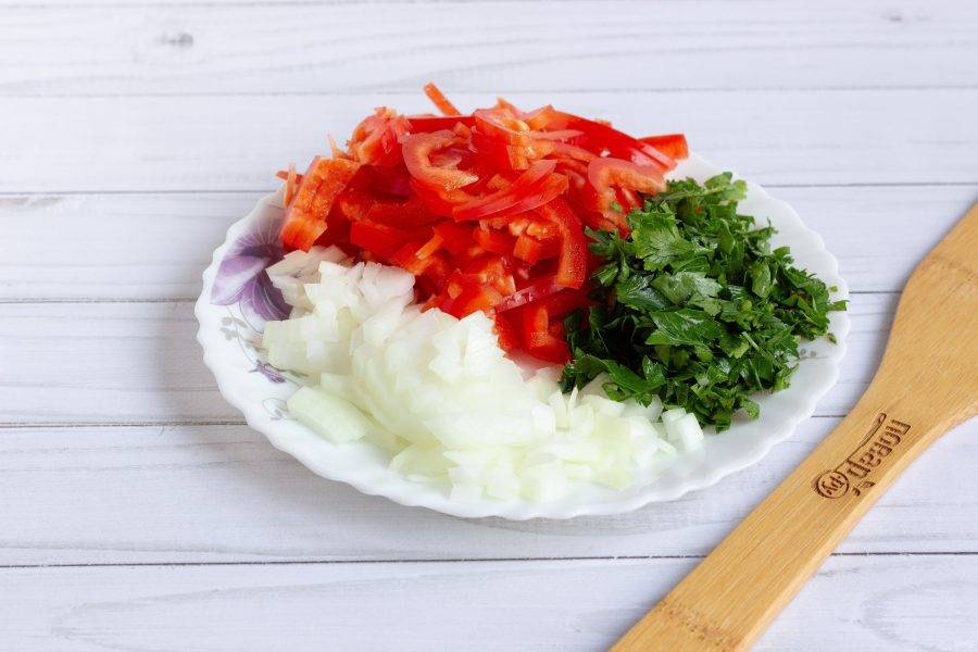 Лук и зелень мелко порубите, перец нарежьте соломкой.