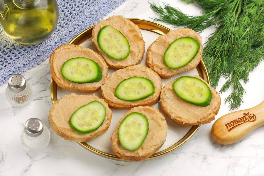 Промойте огурец в воде, срежьте хвостики и нарежьте его половину наискось по диагонали. Выложите по ломтику огурца на икру.