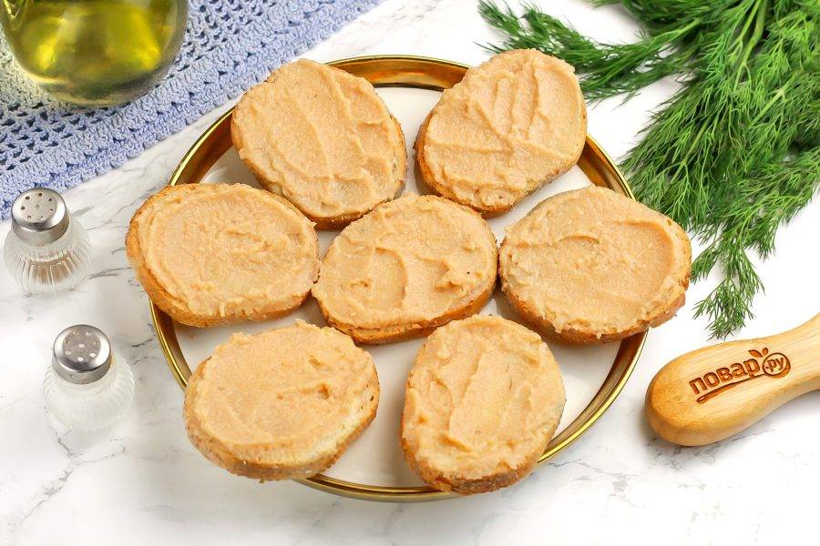 Багет нарежьте порционными ломтиками или сразу же приобретите уже нарезанный. Вскройте баночку с икрой и аккуратно обмажьте ею каждый ломтик хлеба, выложите на тарелку.