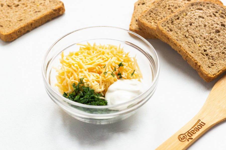 Сыр натрите на мелкой терке. Укроп помойте, веточку оставьте для украшения, остальное порубите. Заправьте сыр и укроп сметаной, посолите и поперчите по вкусу.