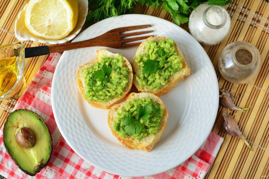 Намажьте бутерброды смесью из авокадо и чеснока. Украсьте зеленью по вкусу и сразу подавайте к столу.