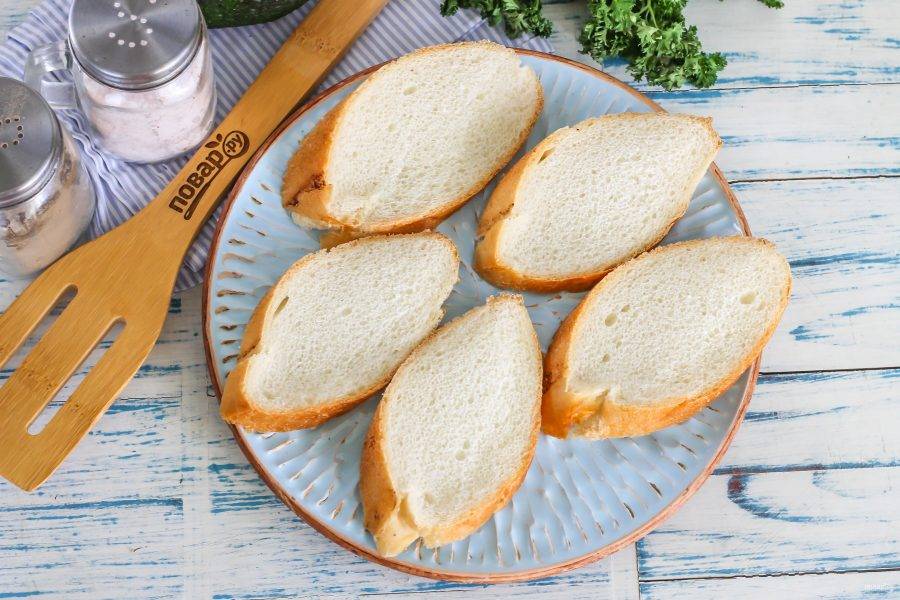 Багет нарежьте диагональными ломтиками и выложите их на тарелку.