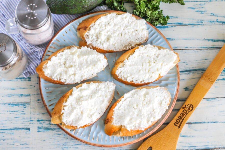 Обмажьте каждый хлебный ломтик творожным сыром. Вместо него можно использовать маскарпоне, сливочный сыр или мягкий плавленный.