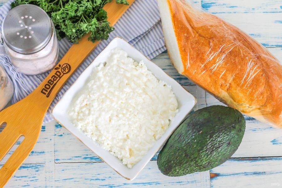 Подготовьте указанные ингредиенты, чтобы приготовить бутерброды с авокадо и творожным сыром. Сорт хлеба может быть любым: белый, ржаной, черный, равно как и форма.