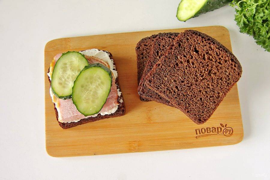 На буженину положите нарезанный кружочками свежий огурец. По желанию можно дополнить бутерброд вареными яйцами или любыми другими сезонными овощами.