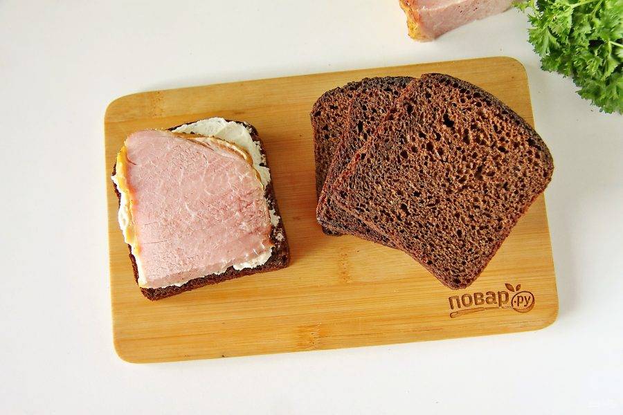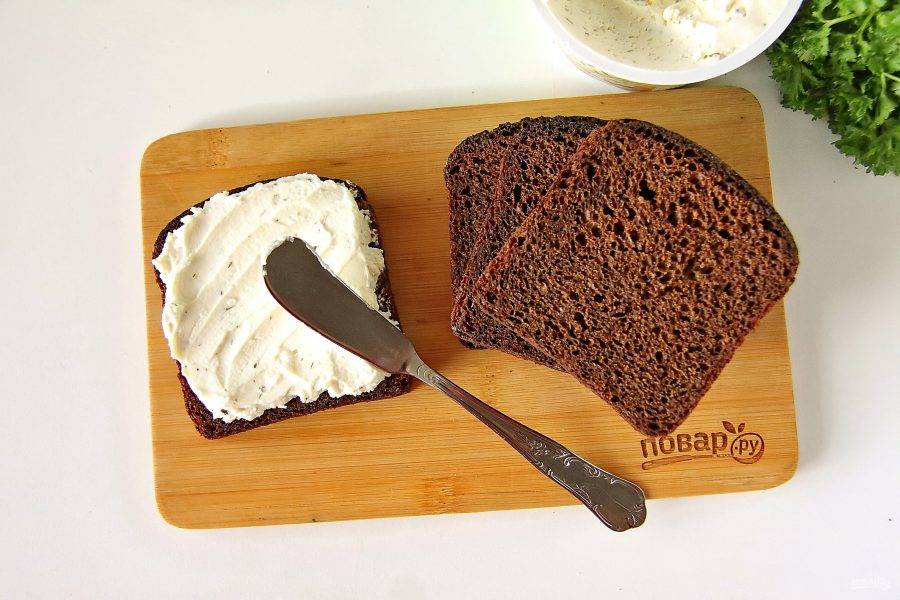 Нарежьте 4 кусочка хлеба, я брала черный (уже в нарезке). Намажьте хлеб нежным творожным сыром, у меня сыр был сразу с зеленью. По желанию творожный сыр можно заменить сливочным или вовсе взять сливочное масло.