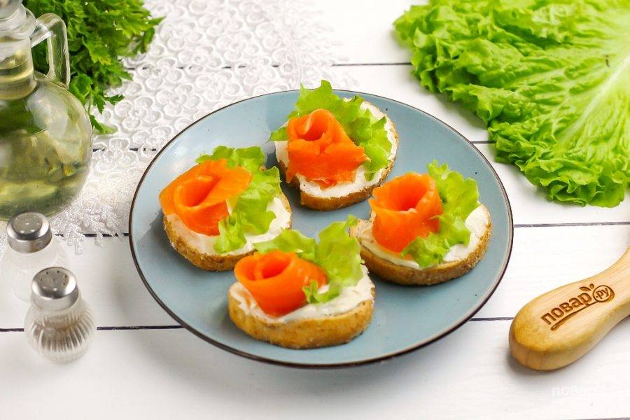 Сверните ломтики форели в виде розочки и выложите на половину ломтика, оставляя вторую половину незаполненной. Можно нарезать красную рыбу кусочками, кубиками.