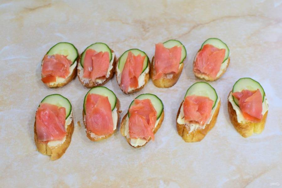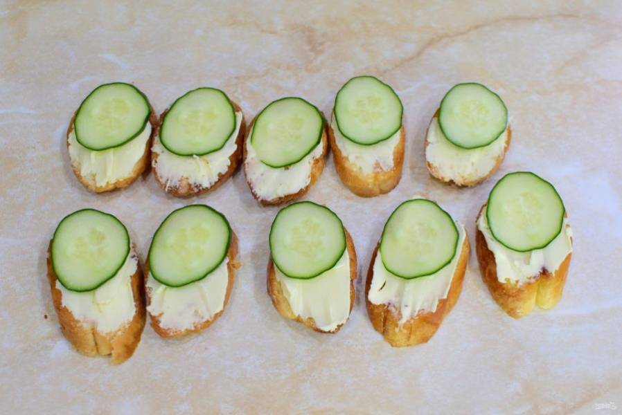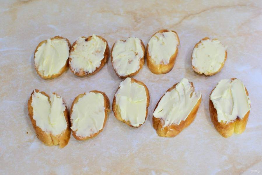 Затем на каждый ломтик багета намажьте сливочное масло.