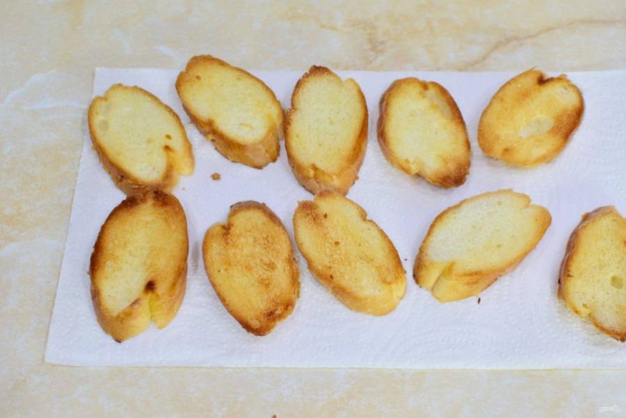 Багет нарежьте на ломтики и немного их поджарьте с двух сторон. Можно поджарить на сухой сковороде или добавить немного сливочного или растительного масла.