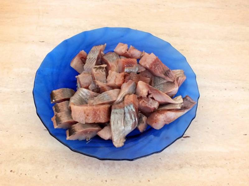Селедку разделайте на филе, удалите все косточки, нарежьте на кусочки.