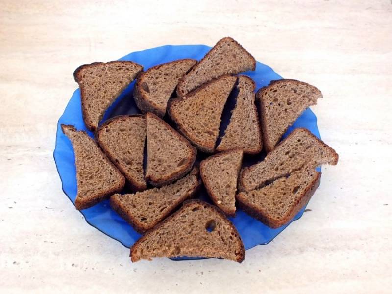 Хлеб нарежьте треугольными или прямоугольными кусочками. Переложите на противень и подсушите в разогретой духовке до 200 градусов, в течение 5-7 минут. После охладите.