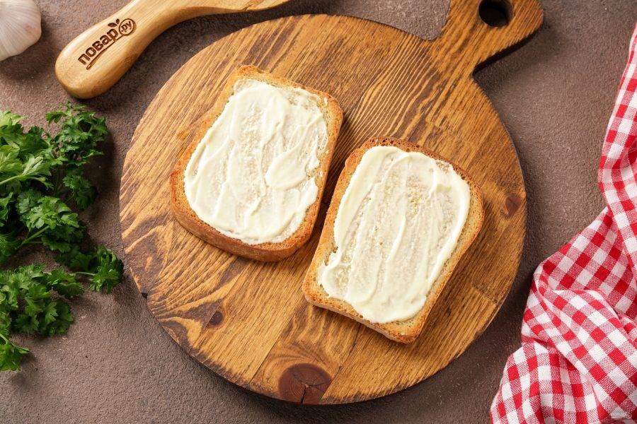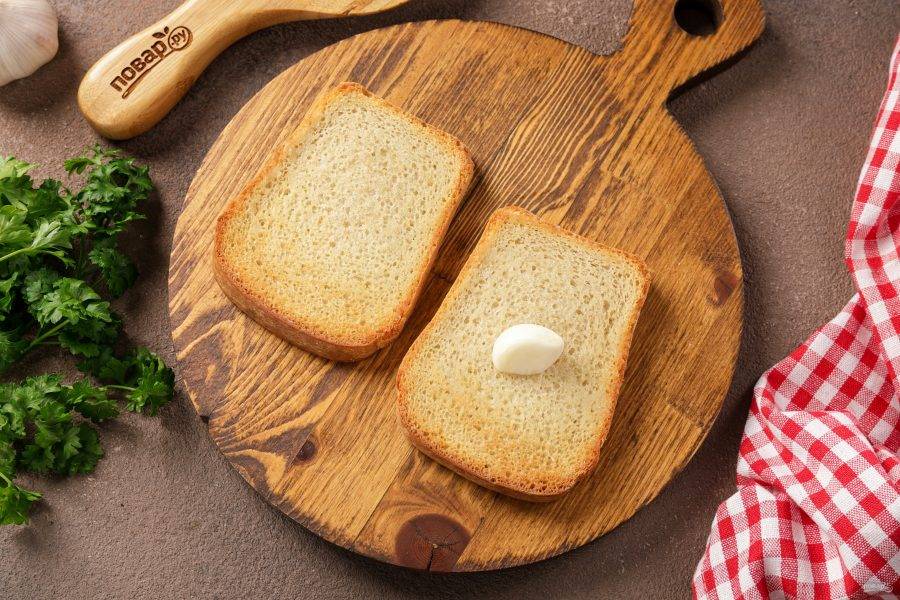 Сбрызните хлеб растительным маслом и подсушите его с двух сторон в духовке или на сухой сковороде. Хрустящие кусочки хлеба натрите зубчиком чеснока.