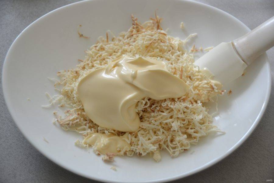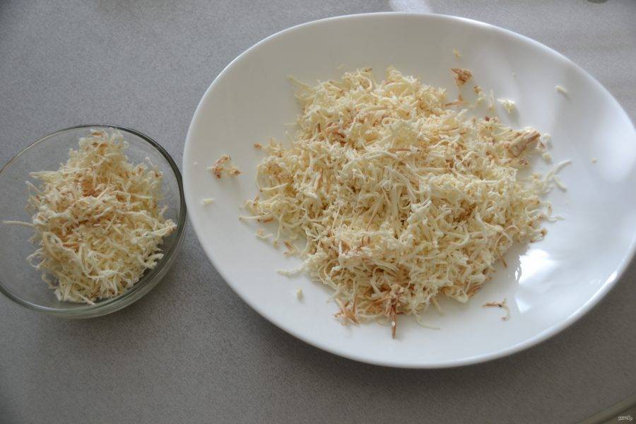 Натрите на терке копченый сыр, часть сыра отложите в отдельную тарелку.