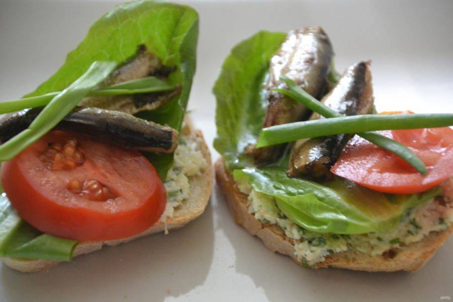 Вариант четвертый: батон, сырная масса, кружочек помидора, шпроты, перышко зеленого лука.