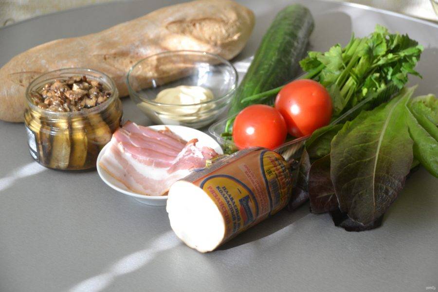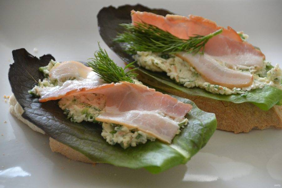 Вариант третий: батон, лист салата, сырная масса, бекон. Использован салат-латук.