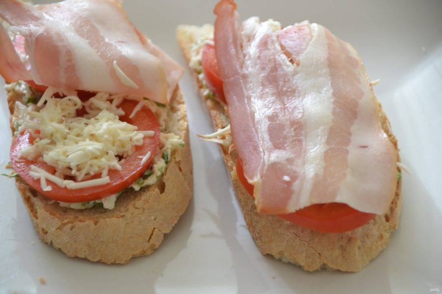 Вариант второй (это будет горячий бутерброд): батон, сырная смесь, кружочек помидора, тертый сыр (без майонеза), ломтик бекона. Отправить в духовку для запекания при температуре 200 градусов на 15 минут.