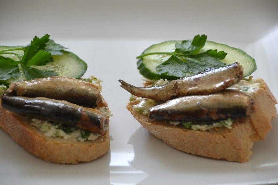 Вариант первый: батон, сырная смесь, шпроты, огурец, зелень.