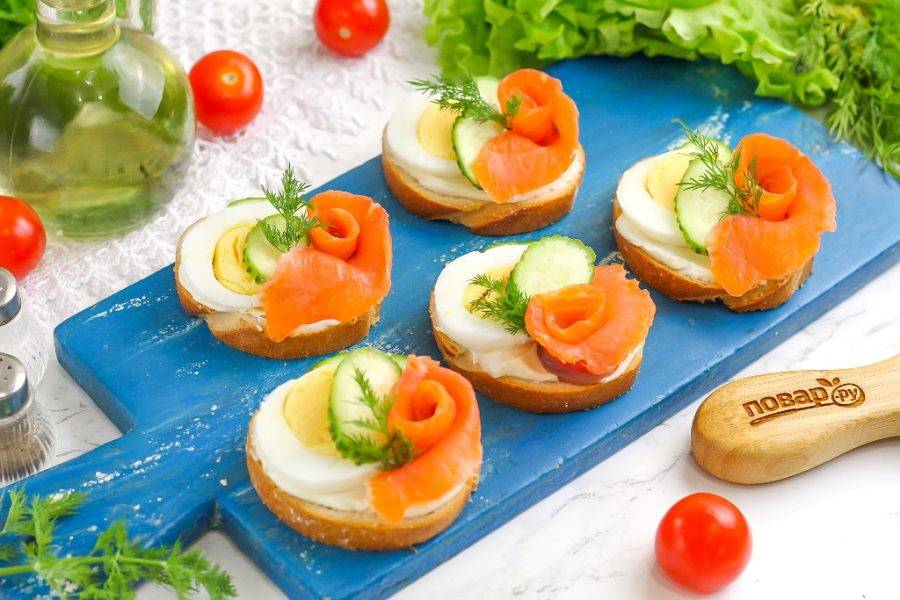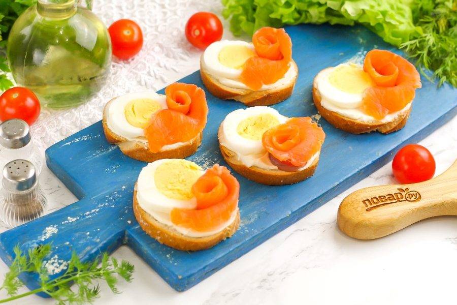 Нарежьте кружочками отварное куриное яйцо и выложите на каждый ломтик. Слабосоленую нарезку красной рыбы разделите и сверните розочками. Выложите ее на бутерброды.