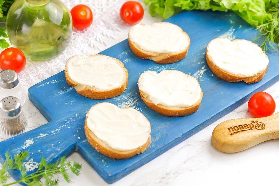 Обмажьте ломтики багета плавленым или мягким творожным сыром. По желанию в сыр заранее можно вмешать измельченную зелень, специи или пряности по вашему вкусу.