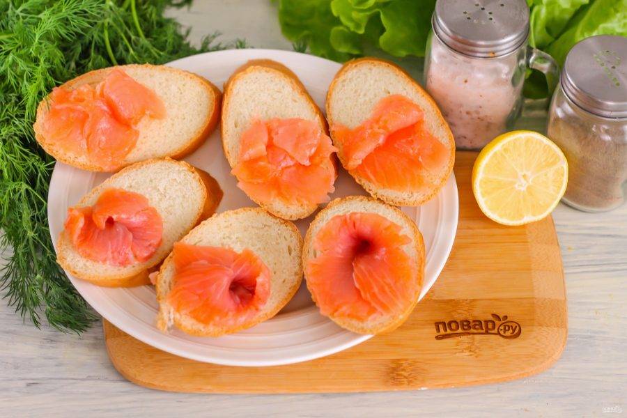 Нарежьте слабосоленую красную рыбу тонкими ломтиками, сверните их в виде роз и выложите на края багетных нарезок.