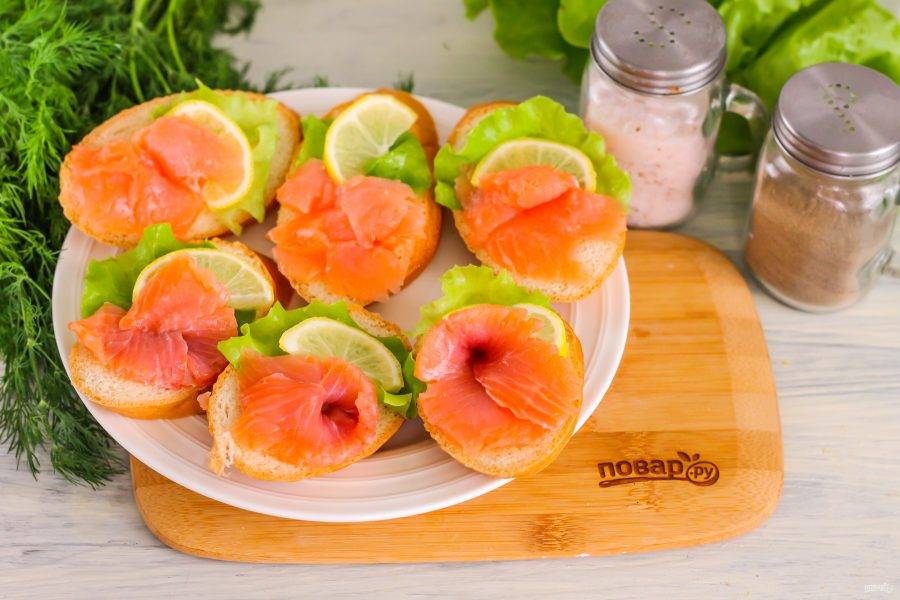 Украсьте приготовленные бутерброды ломтиками лимона и листовым салатом, предварительно промыв его листья в воде и обсушив.