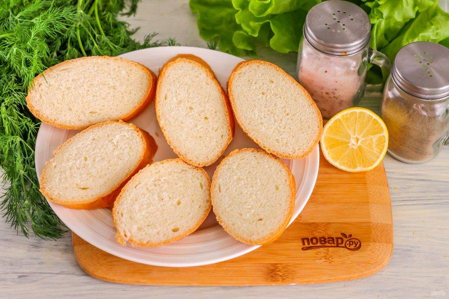 Багет разрежьте по диагонали на две половины. Также по диагонали нарежьте его ломтиками и выложите на тарелку или блюдо.