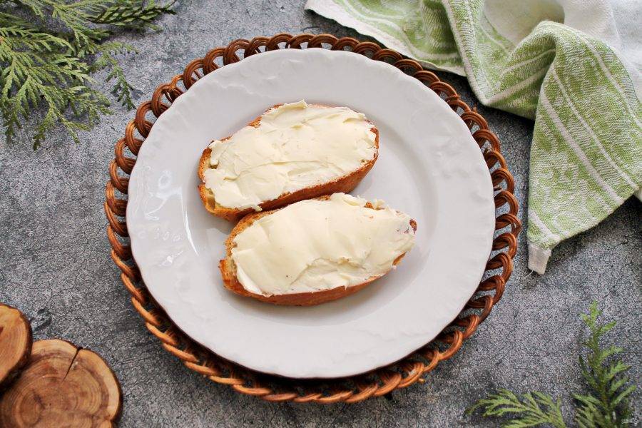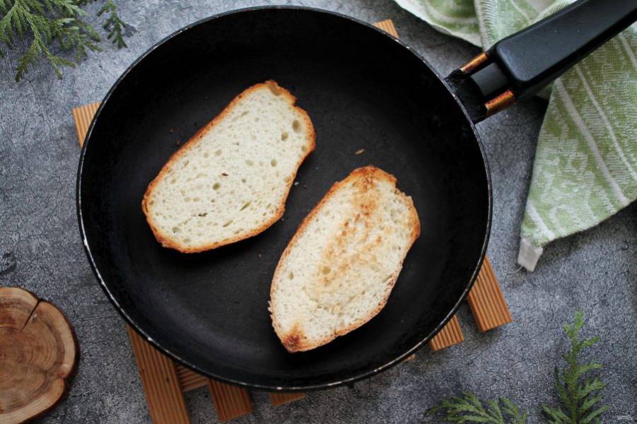Ломтики батона подсушите с двух сторон в горячей сухой сковороде на среднем огне. Снимите их со сковороды и остудите.