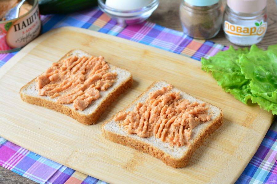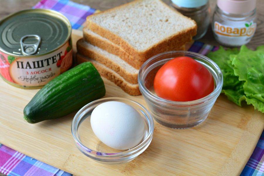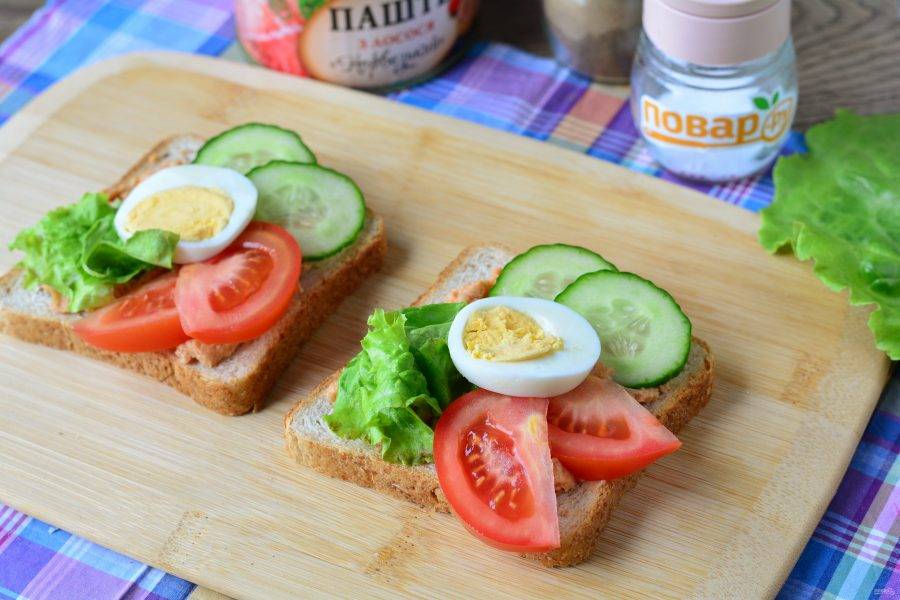 Вкусными и сытными получаются бутерброды с паштетом на праздничный стол. Паштет используйте любой, у меня из лосося. Также понадобятся яйца, хлеб и свежие овощи. Для декора возьмите яркую зелень.