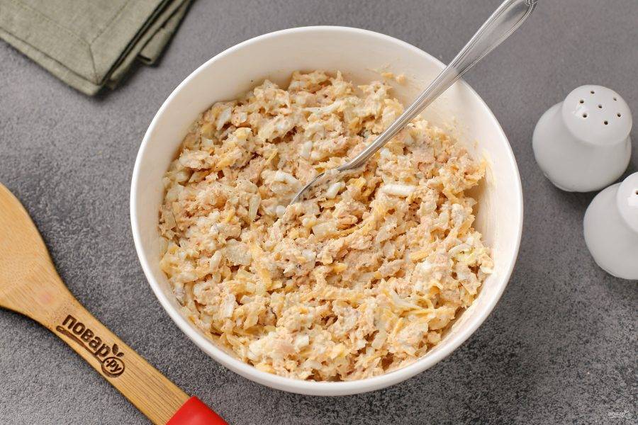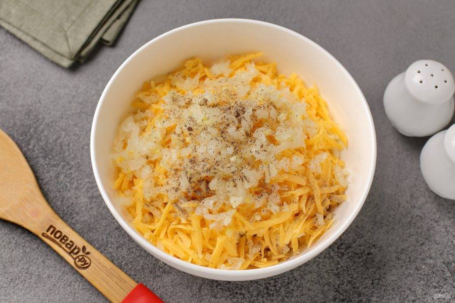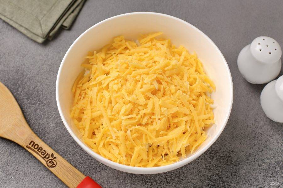 Сыр натрите на тёрке и добавьте к остальным ингредиентам.