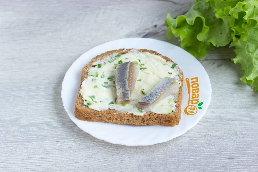 Хлеб намажьте луковым маслом, выложите на него филе сельди.