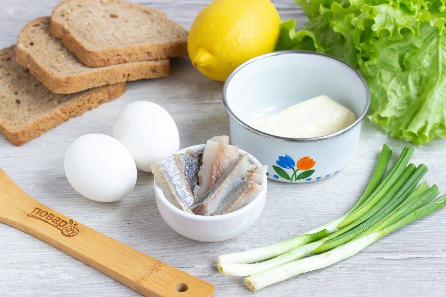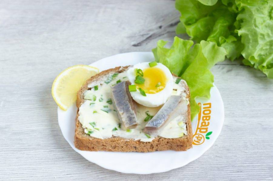 К сельди положите половинку яйца, блюдо украсьте листьями салата и ломтиками лимона. На яйцо и хлеб посыпьте немного рубленного зеленого лука.