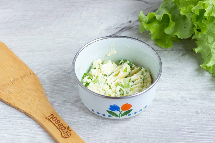 Масло тщательно перемешайте с рубленным зеленым луком (немного лука отложите), при желании масло поперчите и посолите.
