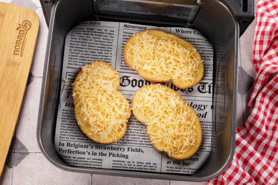 Выложите ломтики хлеба на решётку аэрогриля, застеленную пергаментом. Если вы используете не силиконизированную бумагу, то смажьте её маслом.