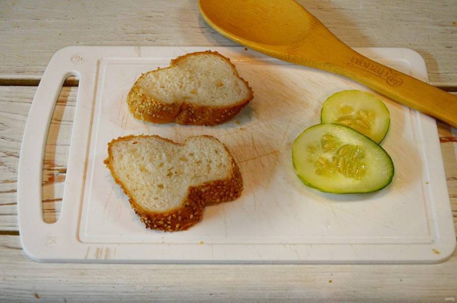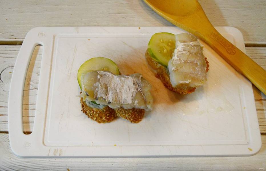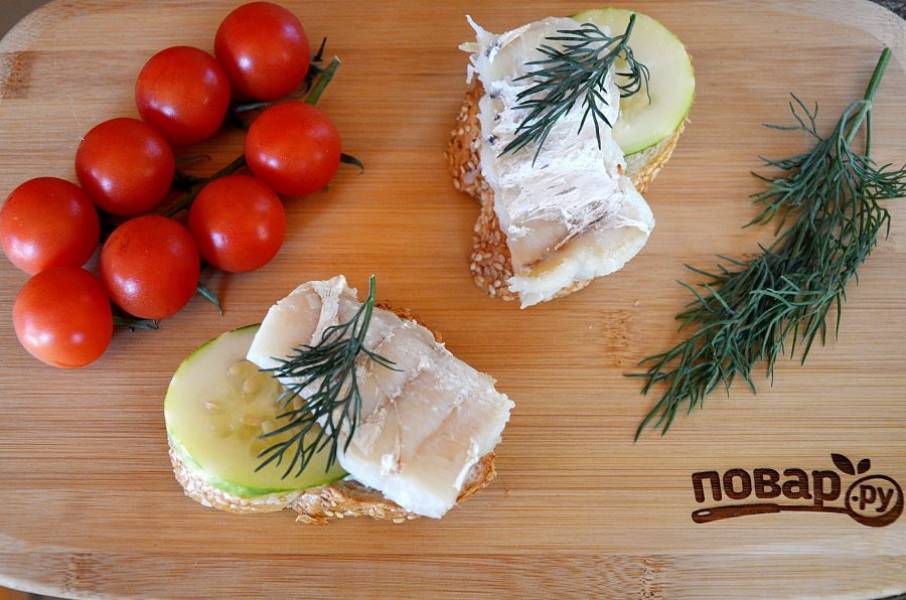 4. Выложите на ломтики хлеба кусочки рыбы и ломтики огурца.