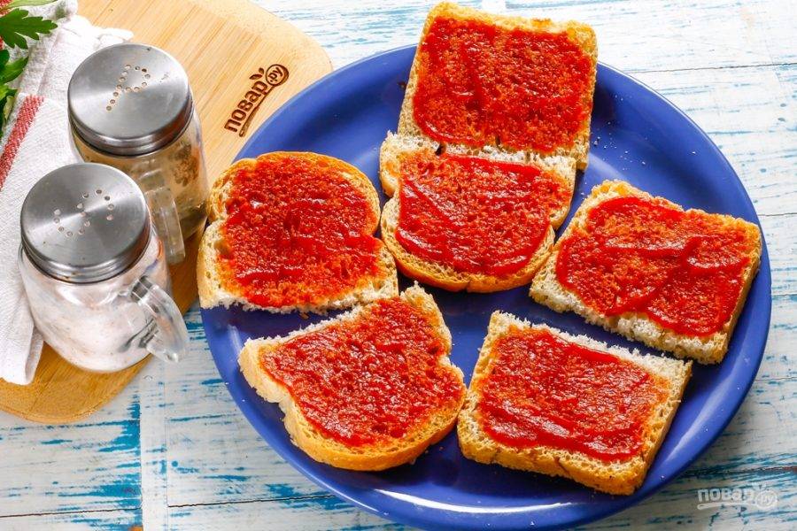 Ломтики хлеба любого сорта разрежьте пополам или же приобретите уже нарезанный хлеб. Обмажьте каждый ломтик кетчупом. Лучше всего использовать кетчуп без добавок, не горький и не пряный.