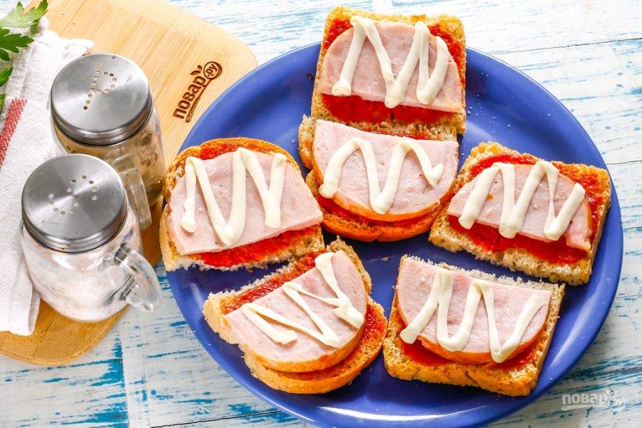 Выложите на ветчину немного майонеза любой жирности или обмажьте им ее - как вам будет удобнее.