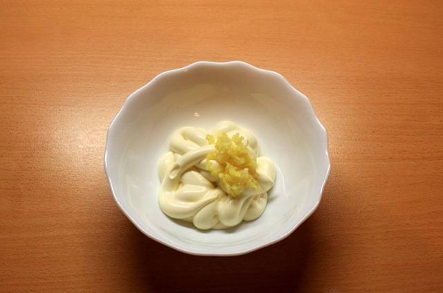 Пропустите чеснок через пресс и смешайте его с майонезом.